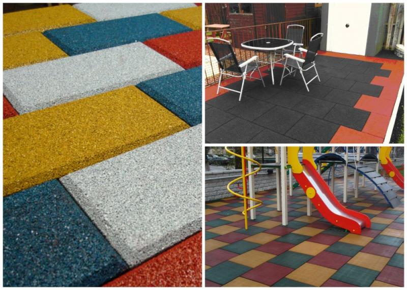 - Покрытие из резиновой плитки может быть различных цветов и толщины. Недостатком такого покрытия является наличие стыков между плитками. В межсезонье туда может попадать вода и плитка деформируется.